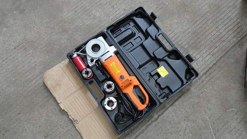 套絲機(jī)工作時(shí),先把要加工螺紋的管子放進(jìn)管子卡盤,撞擊卡緊,按下啟動開關(guān),管子就隨卡盤轉(zhuǎn)動起來,調(diào)節(jié)好板牙頭上的板牙開口大小,設(shè)定好絲口長短,然后順時(shí)針扳動進(jìn)刀手輪,使板牙頭上的板牙刀以恒力貼緊轉(zhuǎn)動的管子的端部,板牙刀就自動切削套絲,同時(shí)冷卻系統(tǒng)自動為板牙刀噴油冷卻,等絲口加工到預(yù)先設(shè)定的長度時(shí),板牙刀就會自動張開,絲口加工結(jié)束.關(guān)閉電源,撞開卡盤,取出管子。